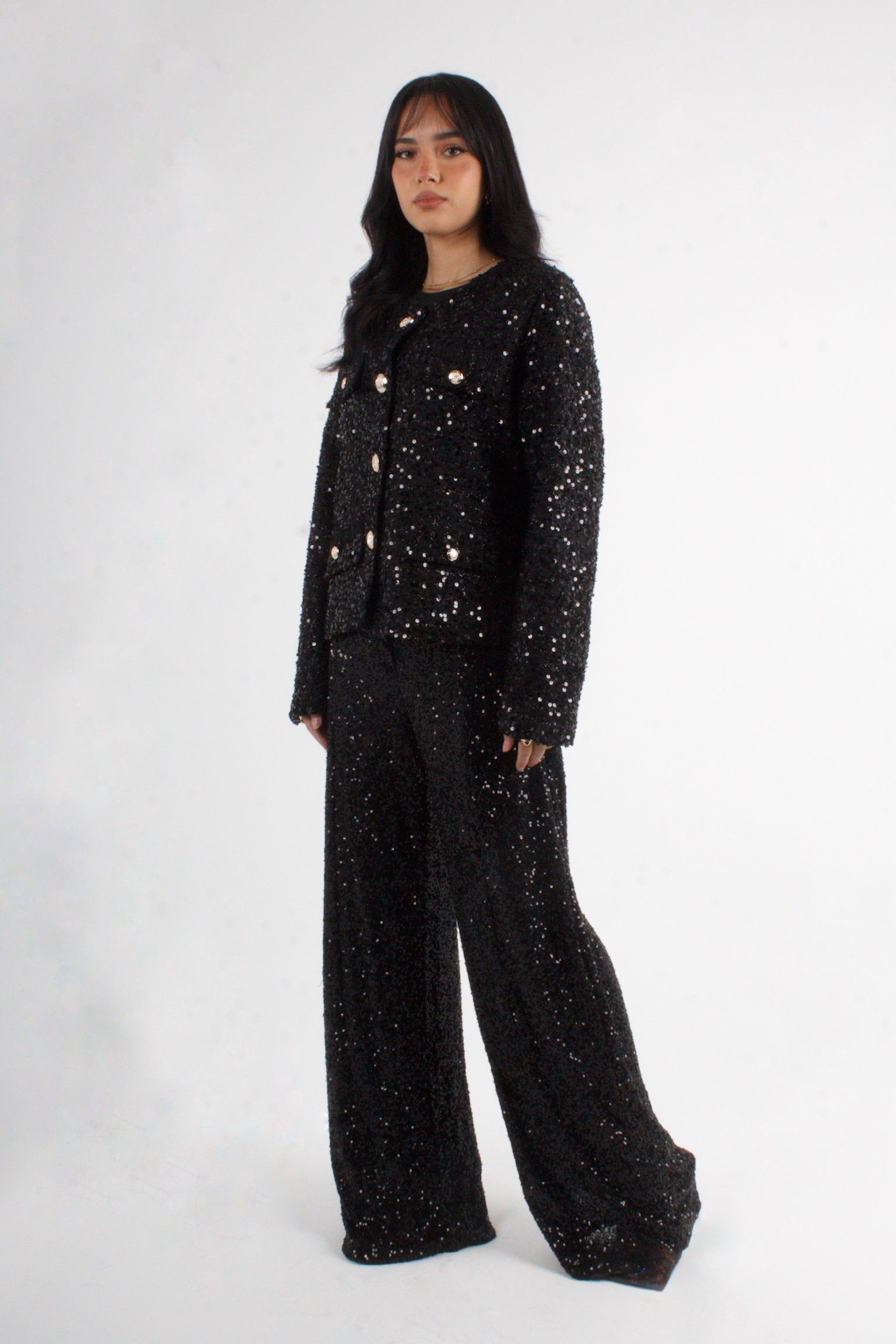 Our best-selling statement four-pocket tweed jacket with gold buttons, with a slight upgrade. The tweed is lightly stitched with sequins pieces, for a seamless shine on a classic favorite.